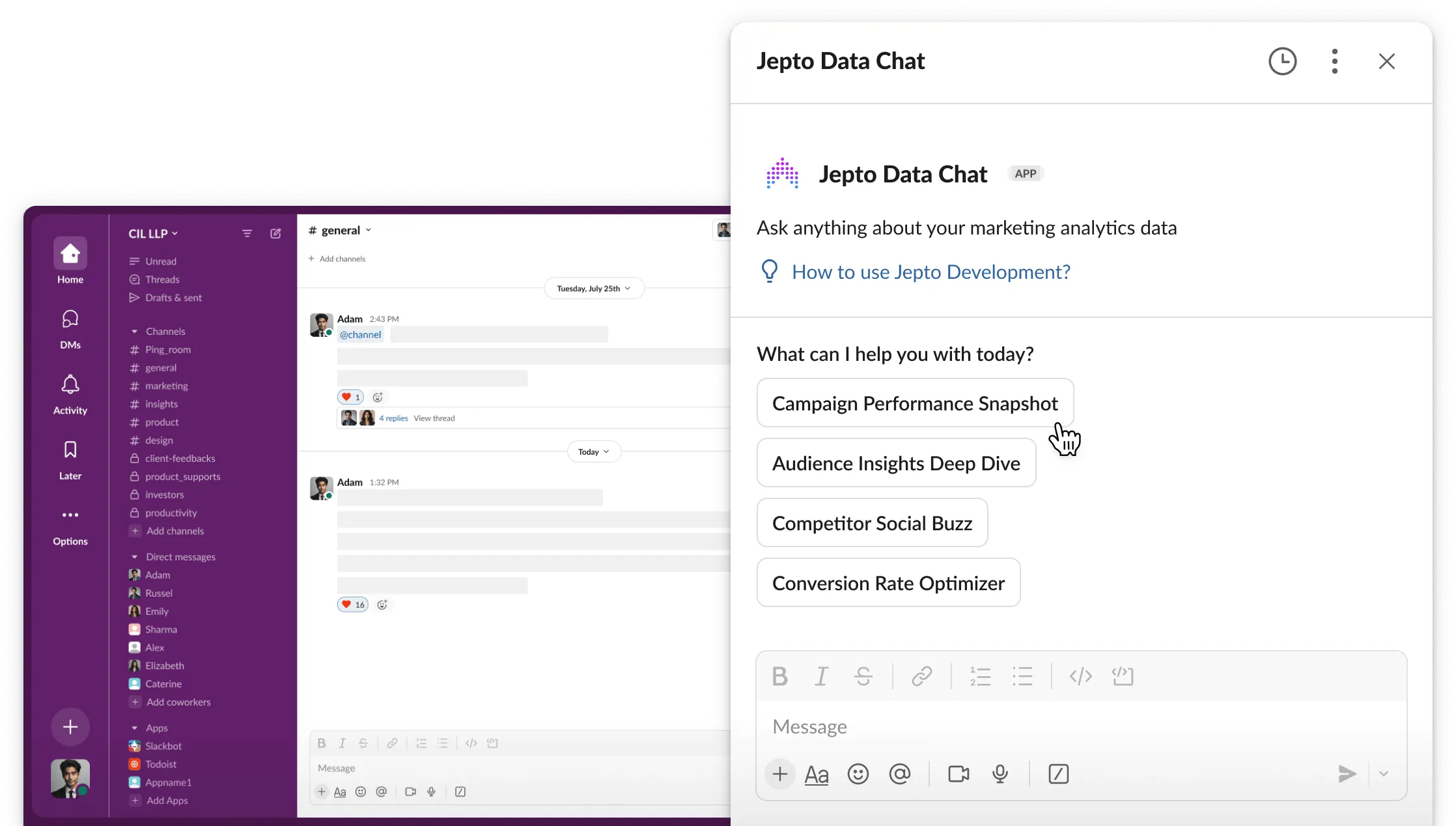 Ask marketing questions in Slack, get AI-powered answers with charts and insights from all your connected data sources.