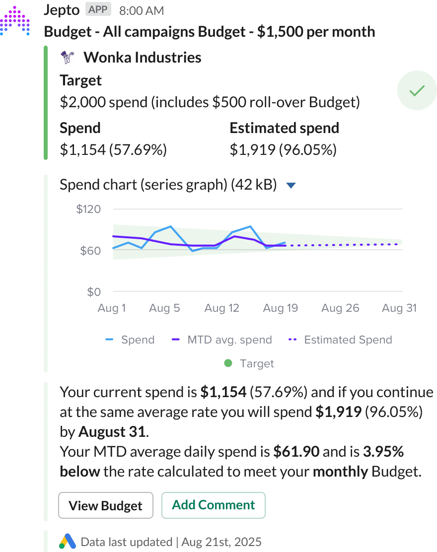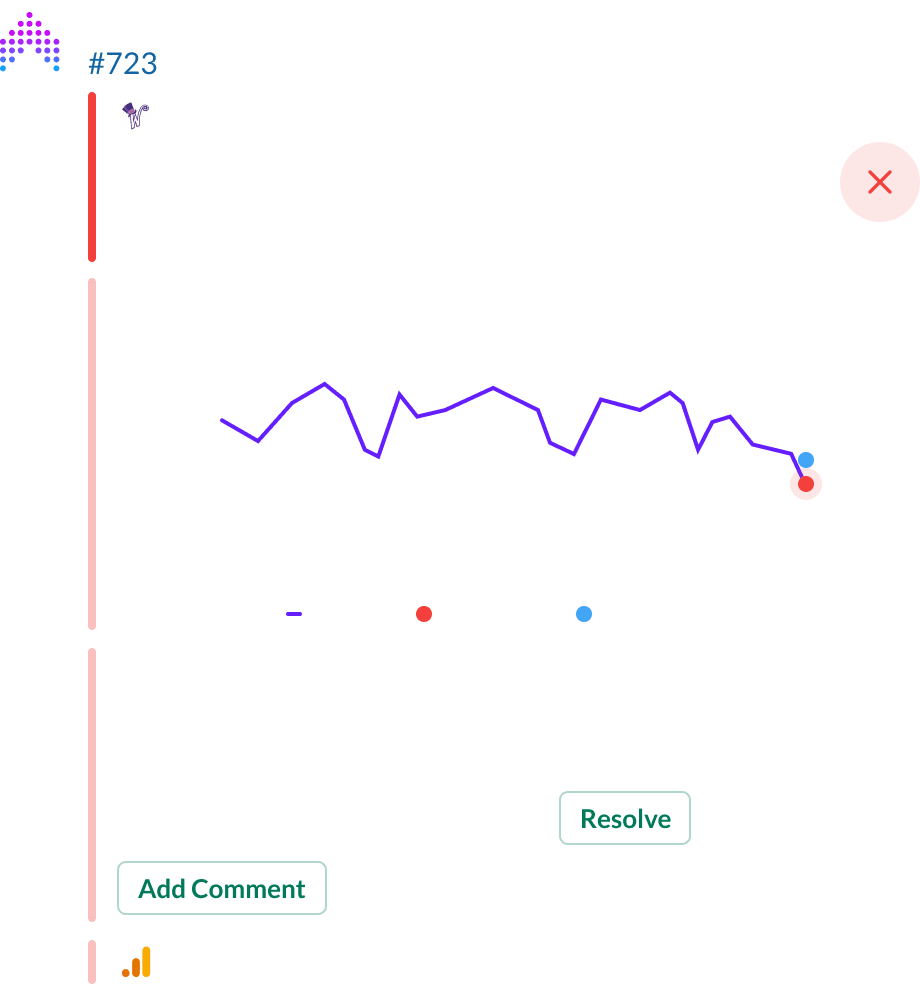Communicate with your team and Clients on actions taken from performance reports or Insights. Each comment submitted in Slack is visible in the App Dashboard and can even be pulled into Data Studio for automated Client reporting.