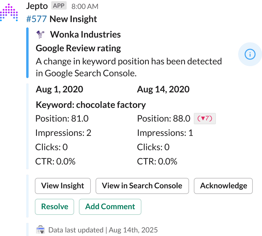 Rich notifications allow you to quickly understand what is going on and direct you to the next steps. Slack messages even get updated when a member of your team Acknowledges or Resolves an Insight from the App, Slack or Zapier. No more wasted time or confusion trying to work out who is working on what.